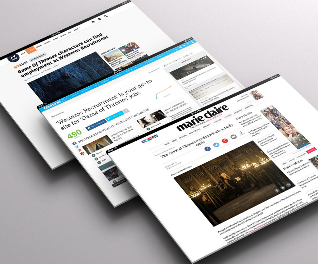 We designed and developed a spoof job website using made up job profiles of deceased characters from Game of Thrones. At the time, Game of Thrones was a popular trend both in the media and online, with a large audience watching each week. By creating a job site, we tapped into the trend by appealing to a wide audience who would find the site funny and easily shareable.